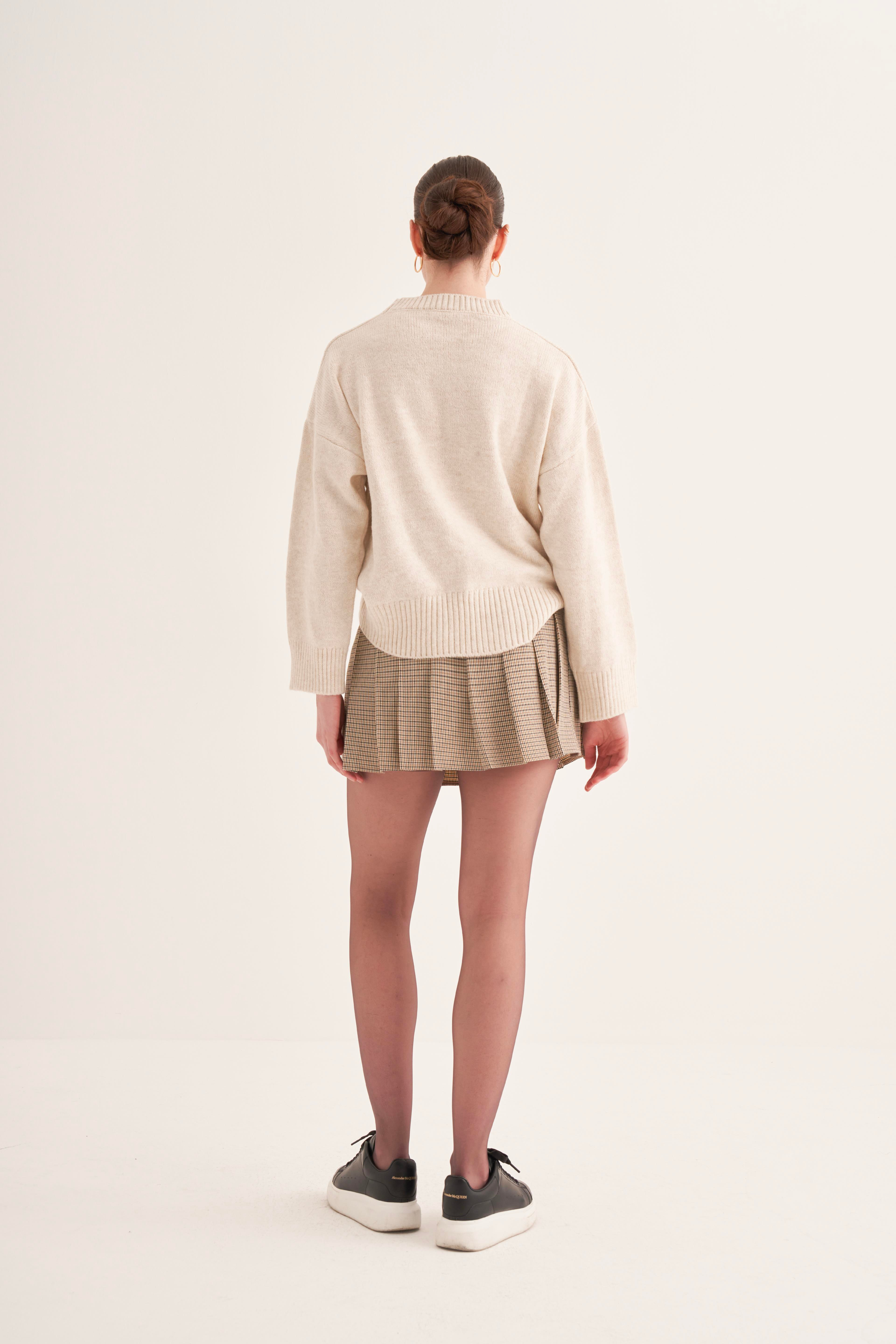 ekoseli, kemer aksesuarlı, ince pilili, yüksek bel mini etek